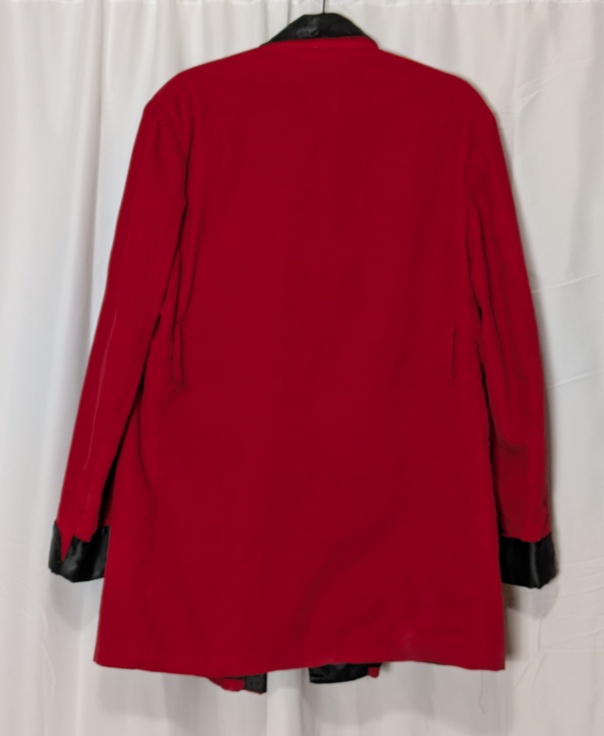 This corduroy tuxedo blazer is a playful addition to your wardrobe. The bold red color is contrasted with sleek black lining and lapel/cuff, creating a unique and eye-catching style. With front pockets and back belt loops (belt not included), this blazer is both functional and fashionable. Plus, it's stain resistant! Measurements: 24" across. No tags - just let your personality shine!