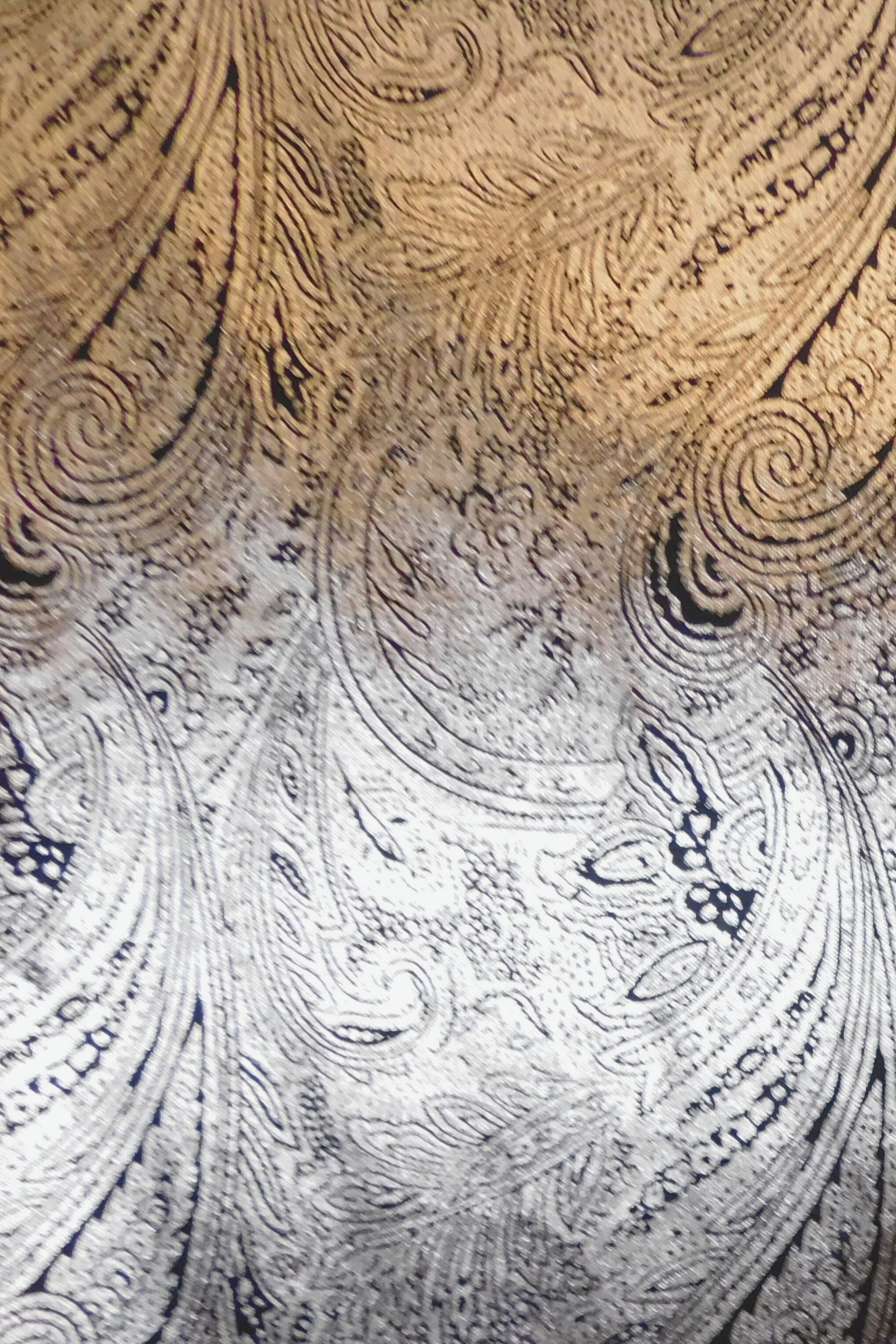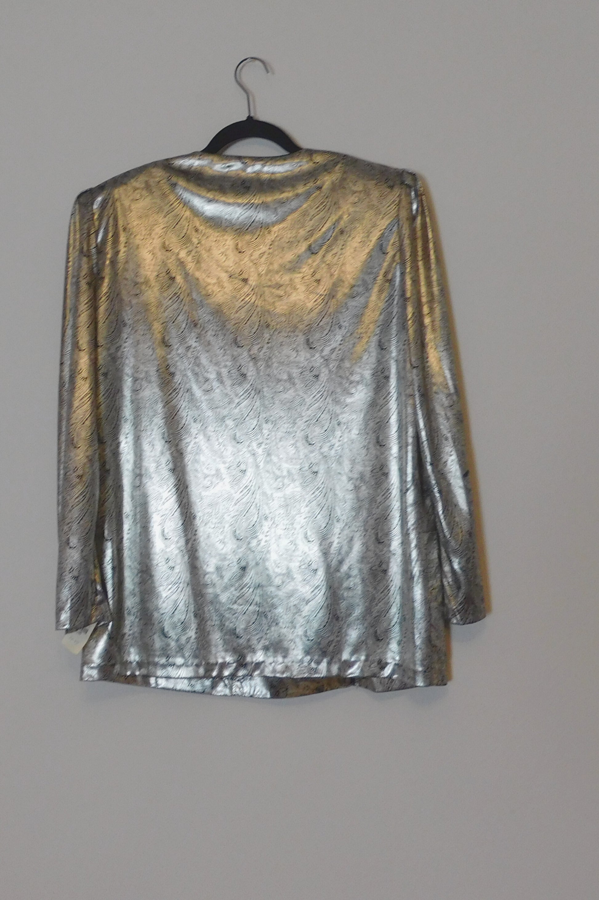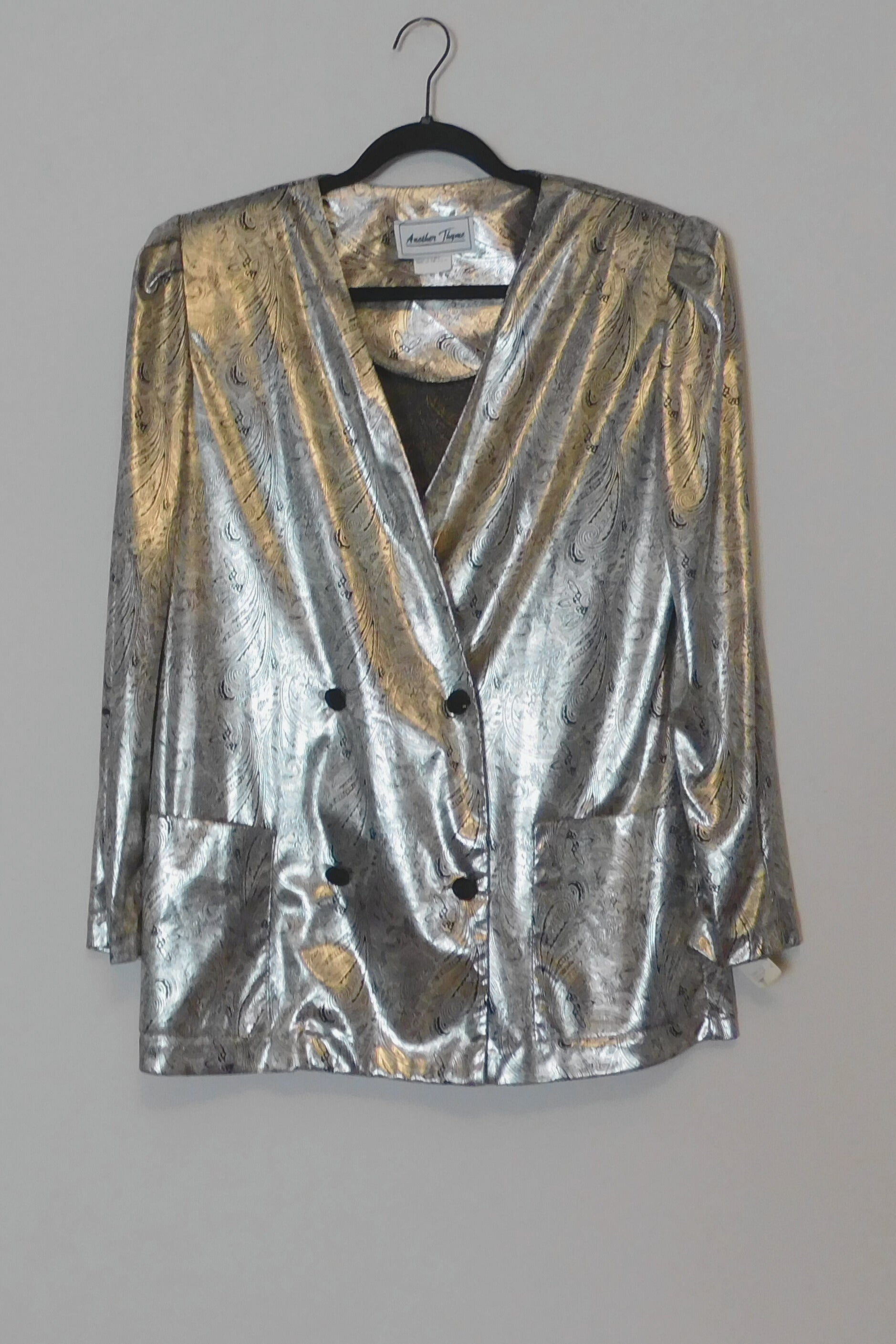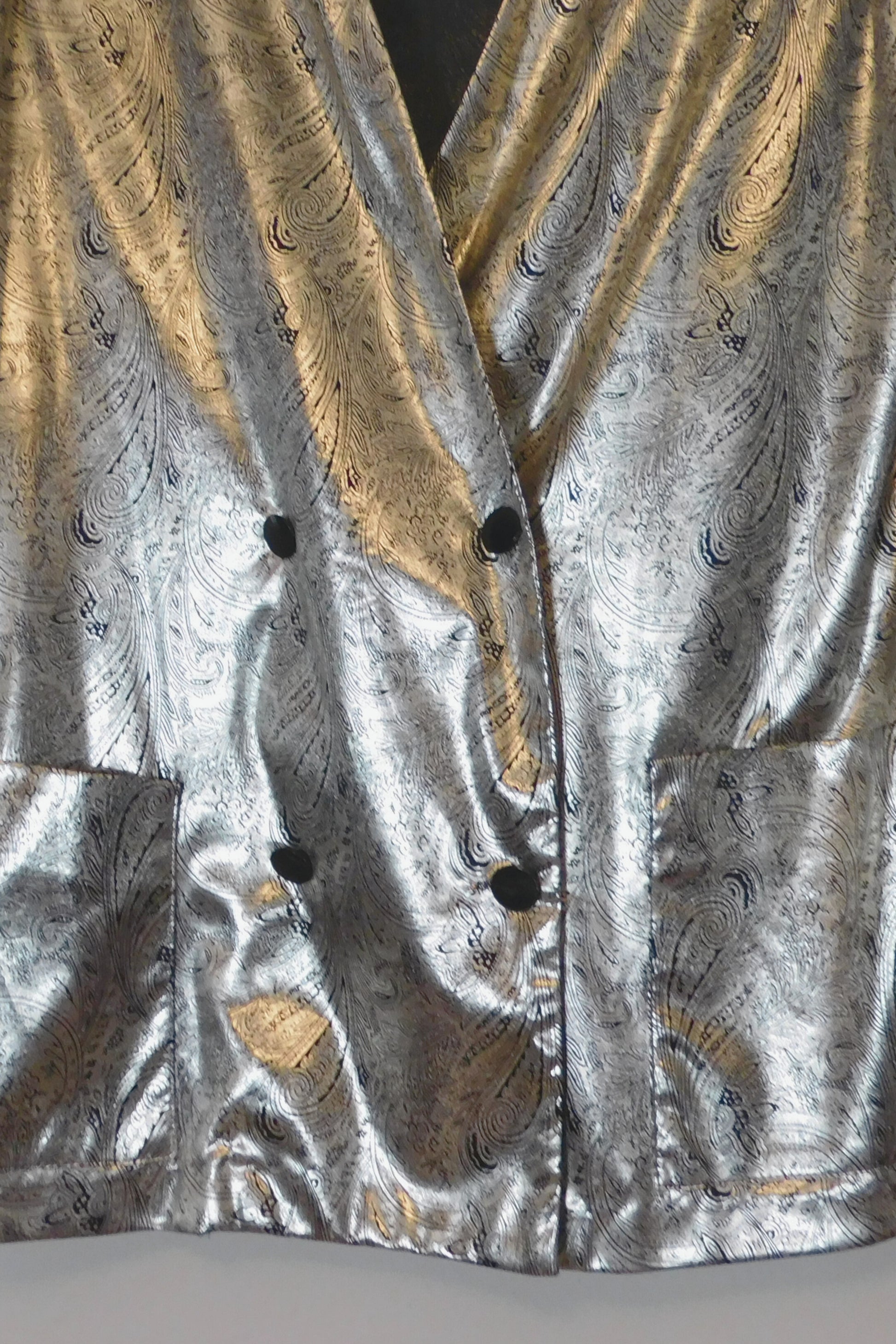 Shine bright like a Silver Bell in this playful, paisley print blazer! The metallic silver background adds a touch of fun to the double breasted design, complete with shoulder pads for a bold silhouette. Measuring (laying flat) at 20 inches in the bust and 27 inches in length, this blazer is sure to make a statement!