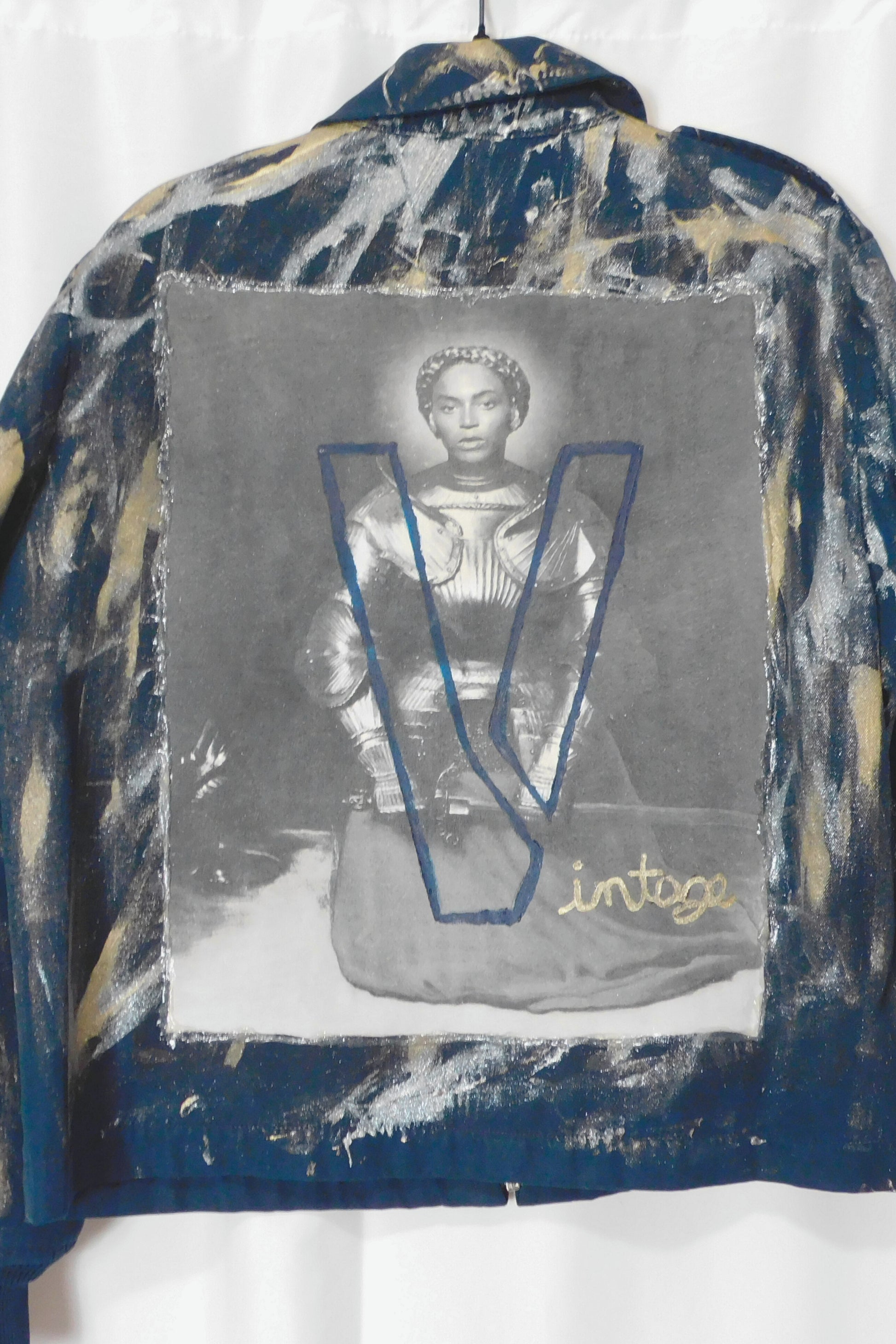 Unleash your inner Beyonce with the SOLDIER OF FORCE Behive Army Zip Front Jacket. This navy blue jacket features unique silver and gold paint patterns, a V patch in front, and a Beyonce graphic on the back made from an old tee shirt. In a size medium, with bust and waist measurements of 21 and 19 inches (flat), this jacket is a true statement piece.