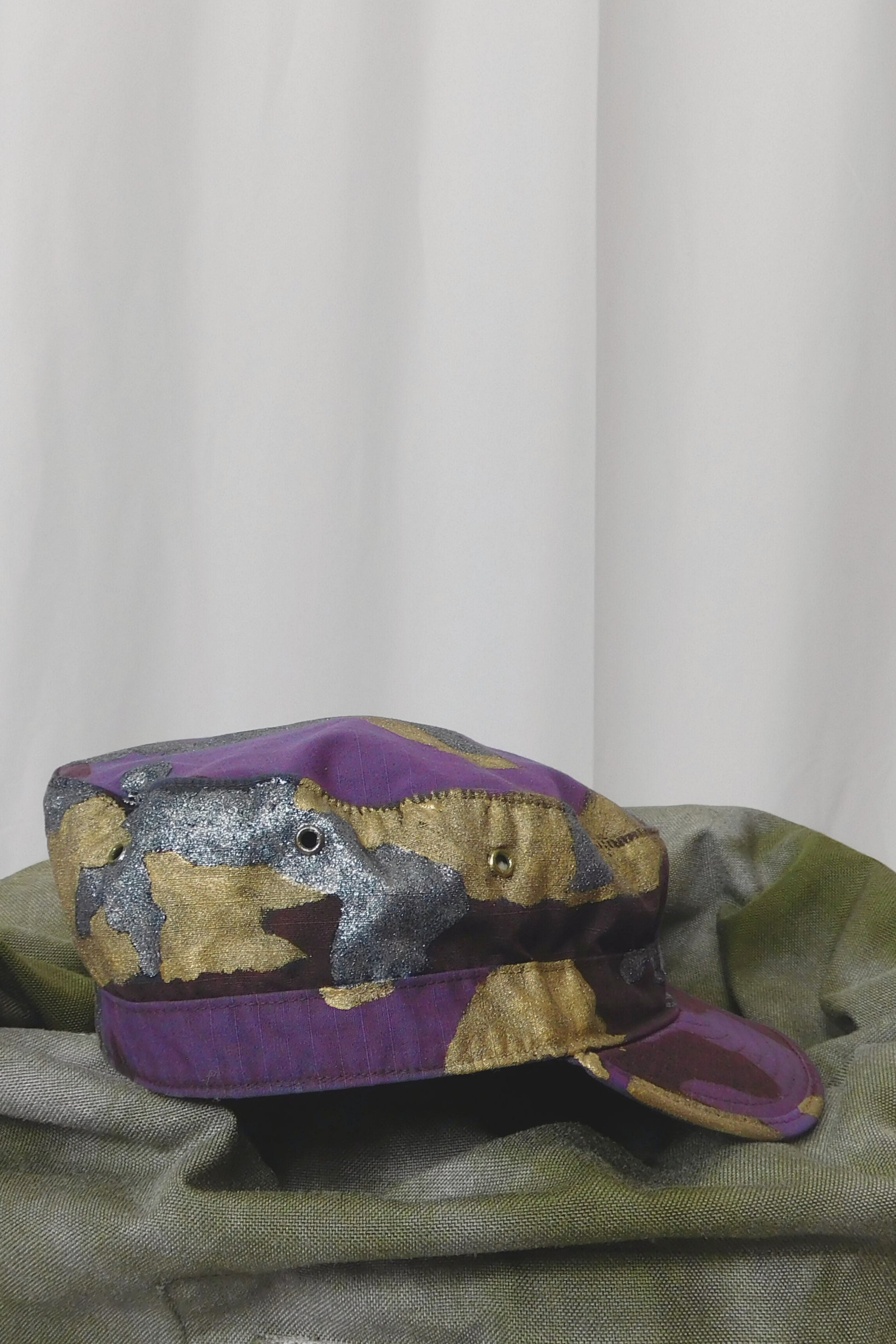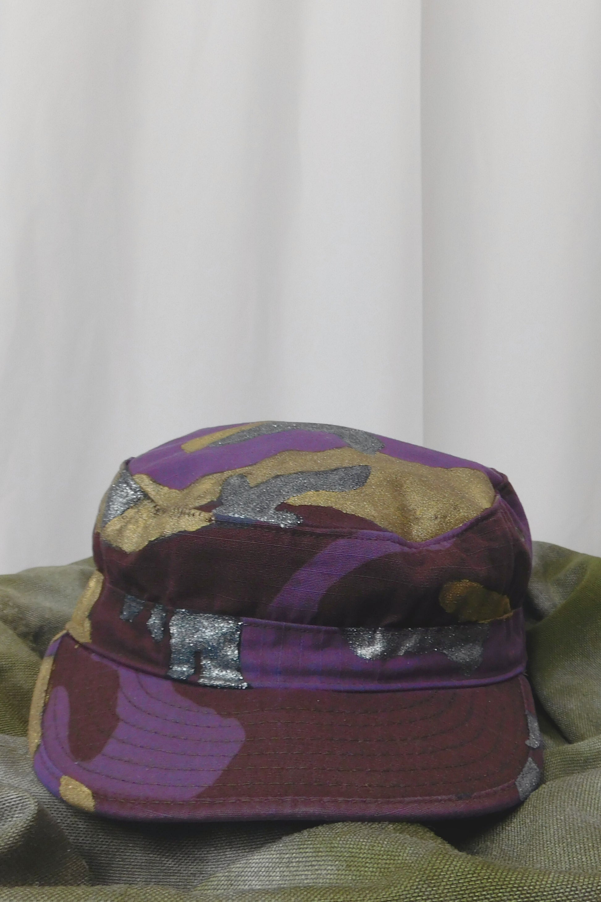 Get ready to stand out in style with the SOLDIER OF FORCE Fancy Metallic Camo Hat. This unique hat features a hand-painted camo design in silver and gold on a vibrant purple background. With a size of 7.5 inches, this hat is sure to make a statement.