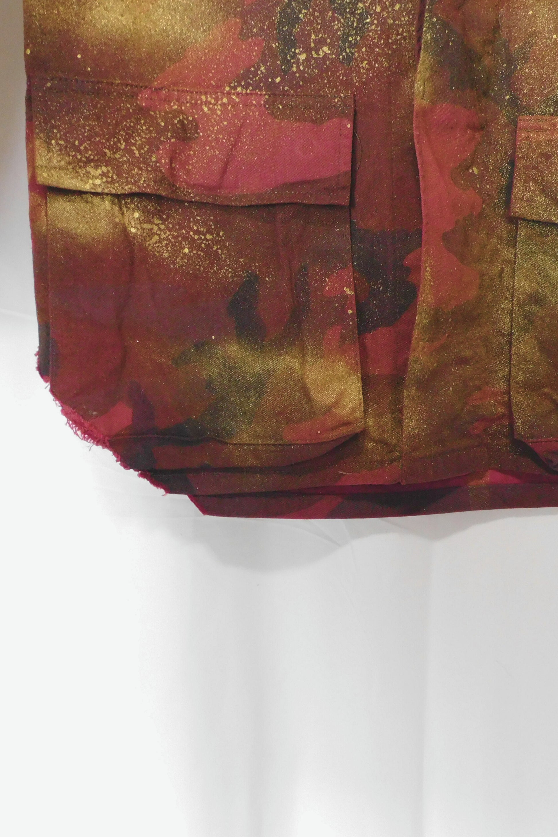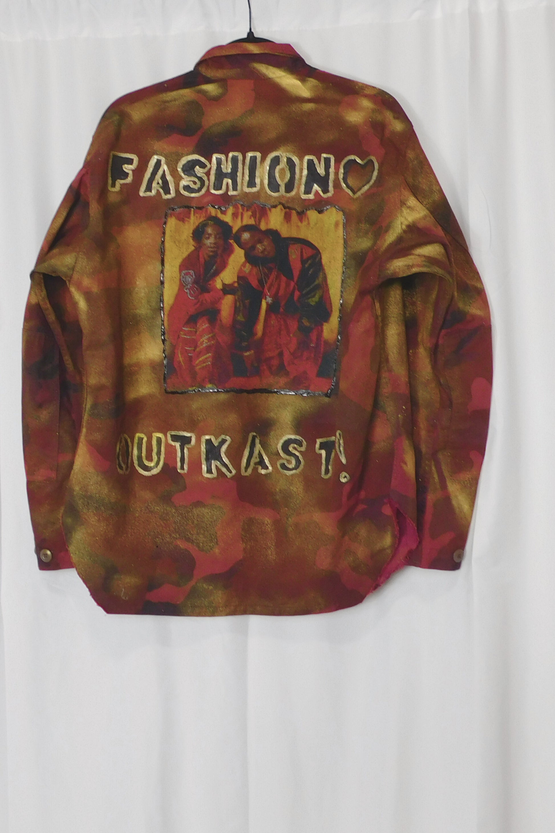 Unleash your inner OutKast with our SOLDIER OF FORCE Fashion Camo Shacket! This burgundy jacket features a unique curled hemline and gold paint accents. With a bold graphic print of the iconic group on the back, this jacket is perfect for making a statement. Size XL, measurements: bust 22", waist 22", length 29" (flat)