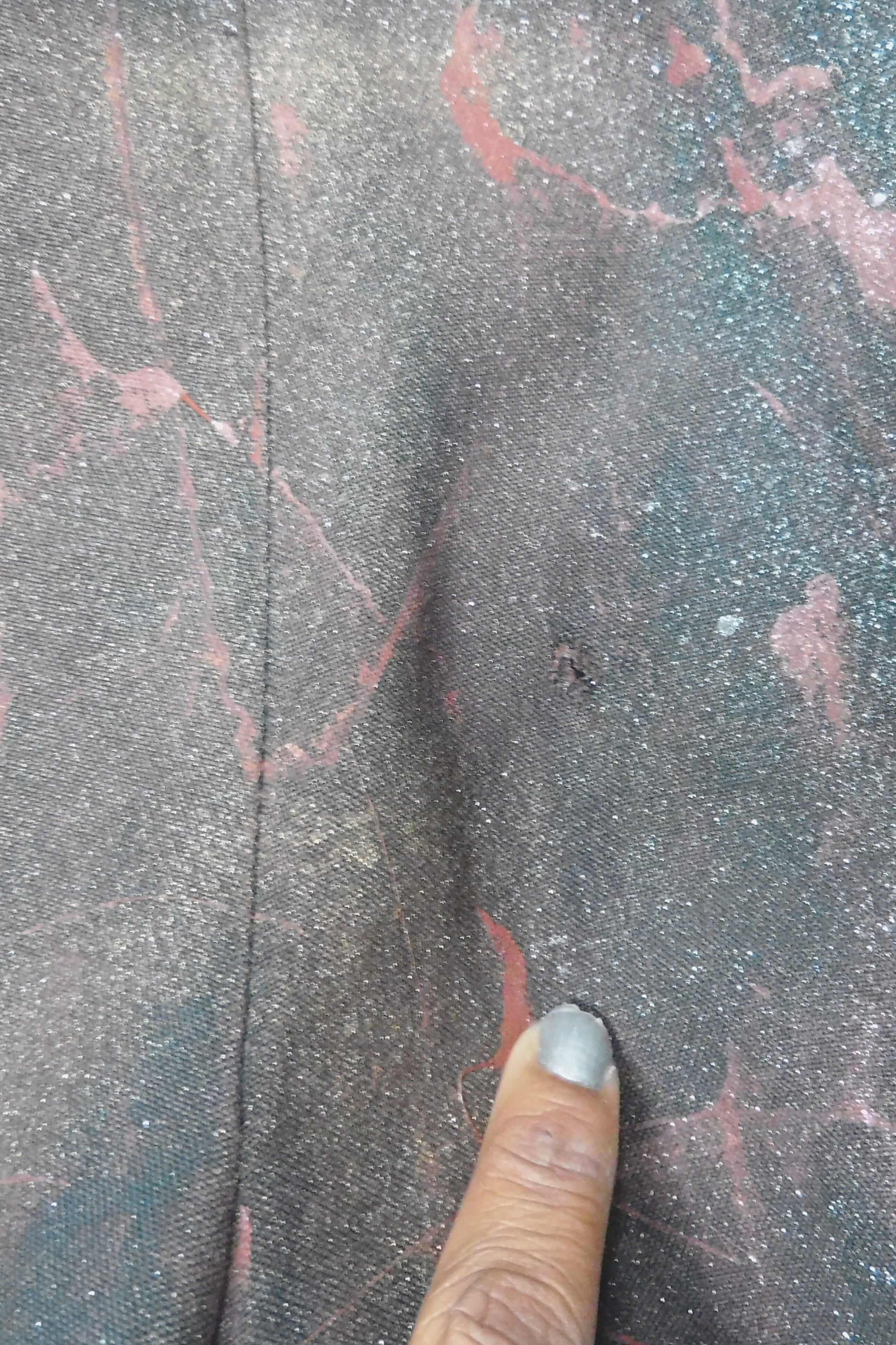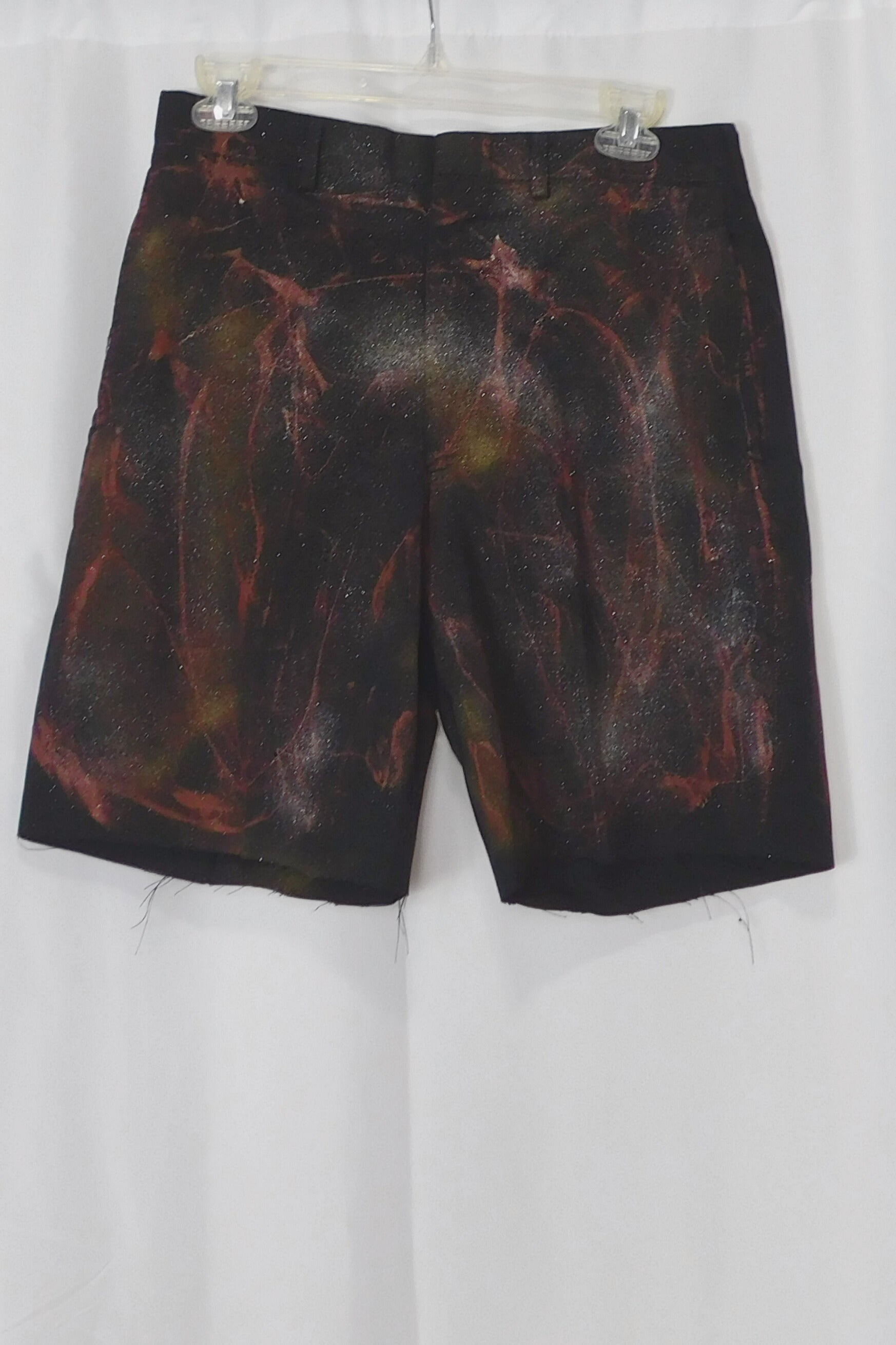 Rock the SOLDIER OF FORCE Getting My Shine On Painted Shorts! These black shorts with burgundy paint and silver shimmer add a touch of edge to any outfit. With a front zip, raw hem (Note: small hole in the back), these shorts are a must-have. Size S/M: waist 15", hips 18", inseam 8" (flat).