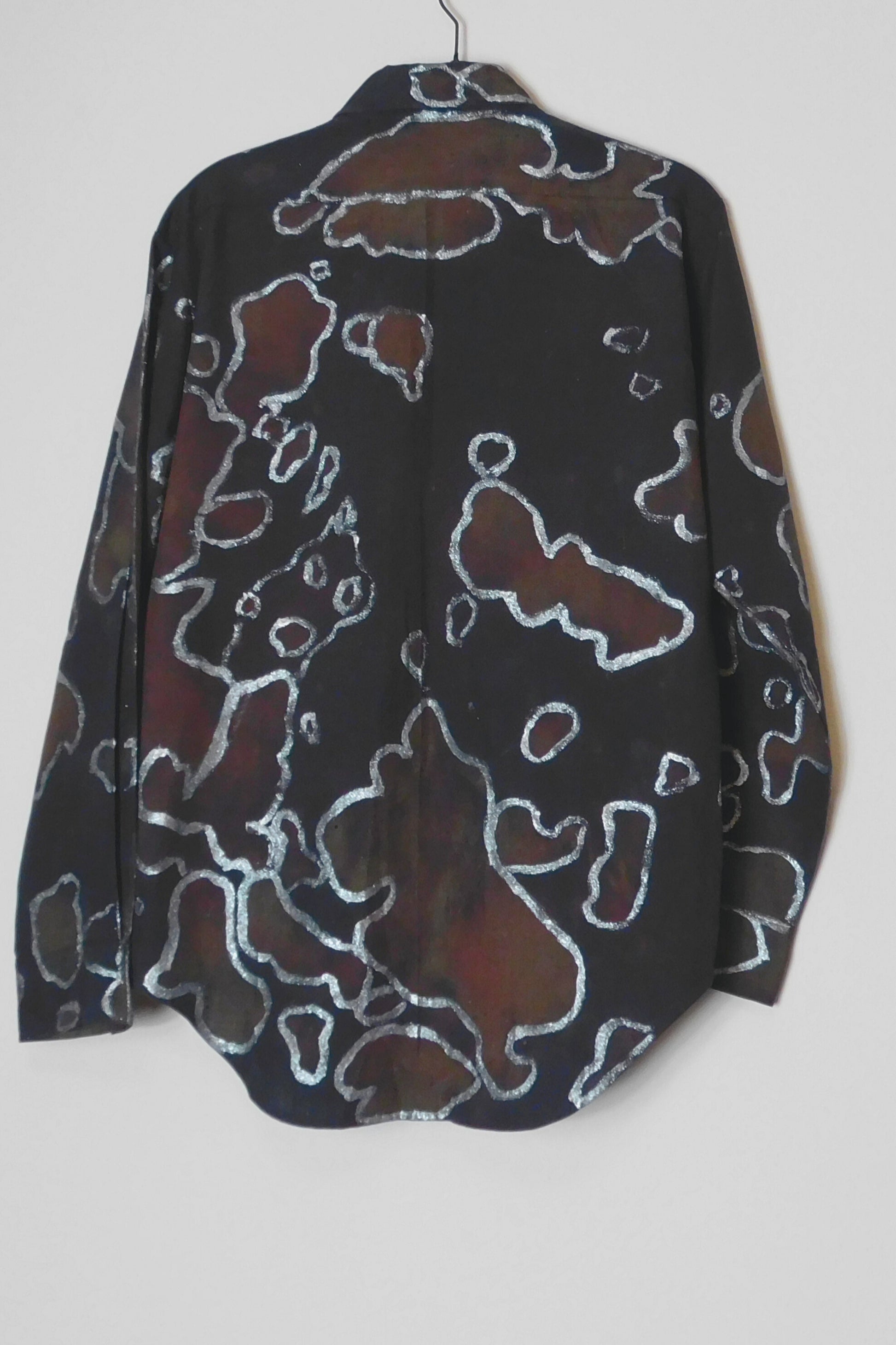 Add some shine and camo to your wardrobe with the SOLDIER OF FORCE My Camo Shining! Button Up Top. Originally a vintage military button up, this top has been reworked with a unique tie dye and handpainted silver camo design. Lightweight and versatile, it's perfect for both men and women in a size large or medium, with chest and waist measurements laying flat of 21 and 22 inches respectively. Rock a one-of-a-kind look with this top!