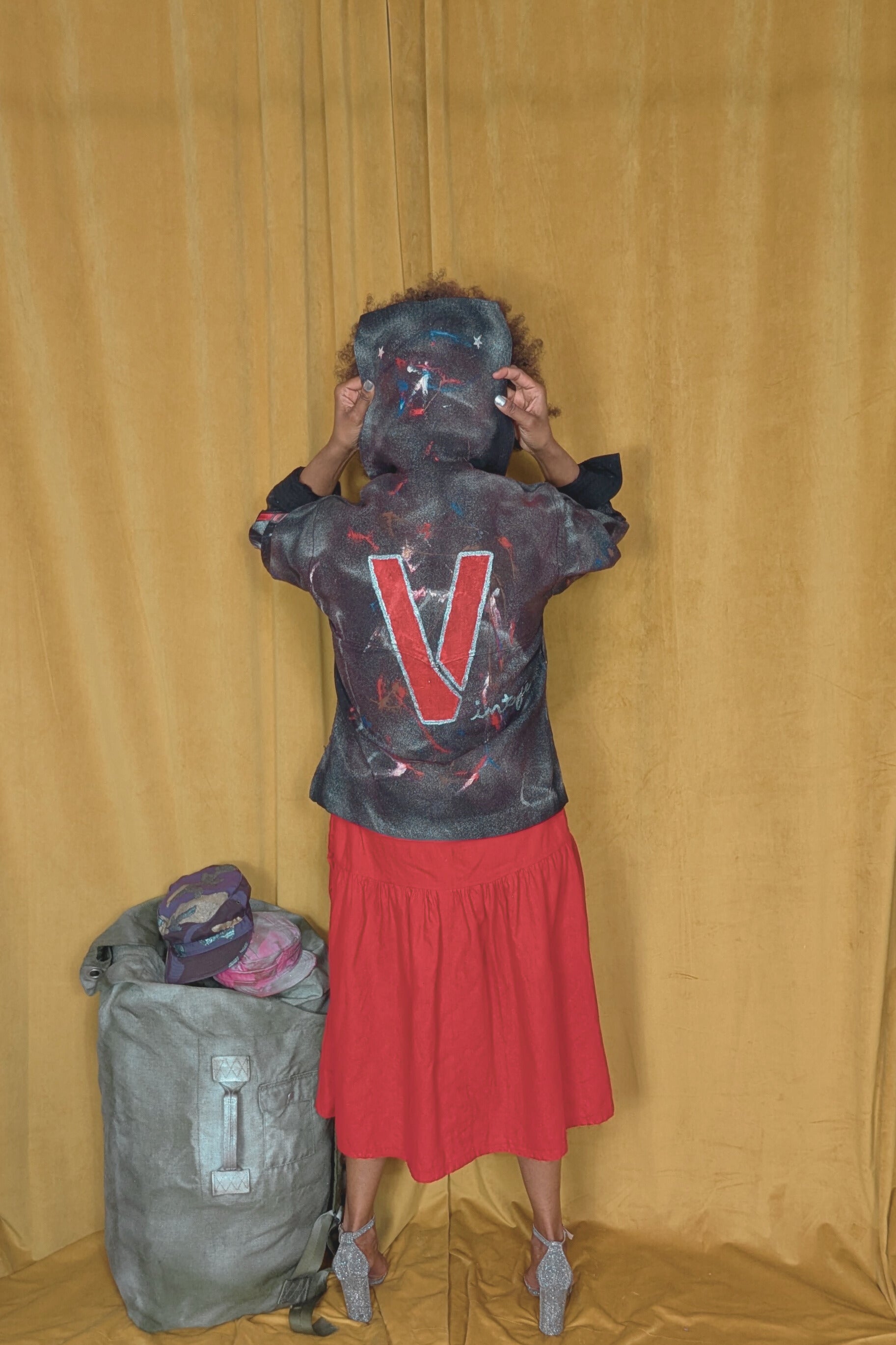 Get ready to set sail in this SOLDIER OF FORCE Black Sailor Jacket! This unique jacket combines traditional sailor elements with a modern twist, featuring a playful red, blue, and brown paint pattern and a bold V graphic on the back. Size M/L with bust and waist measurements of 19 and 18 inches (flat). Prepare to make a statement on the high seas!