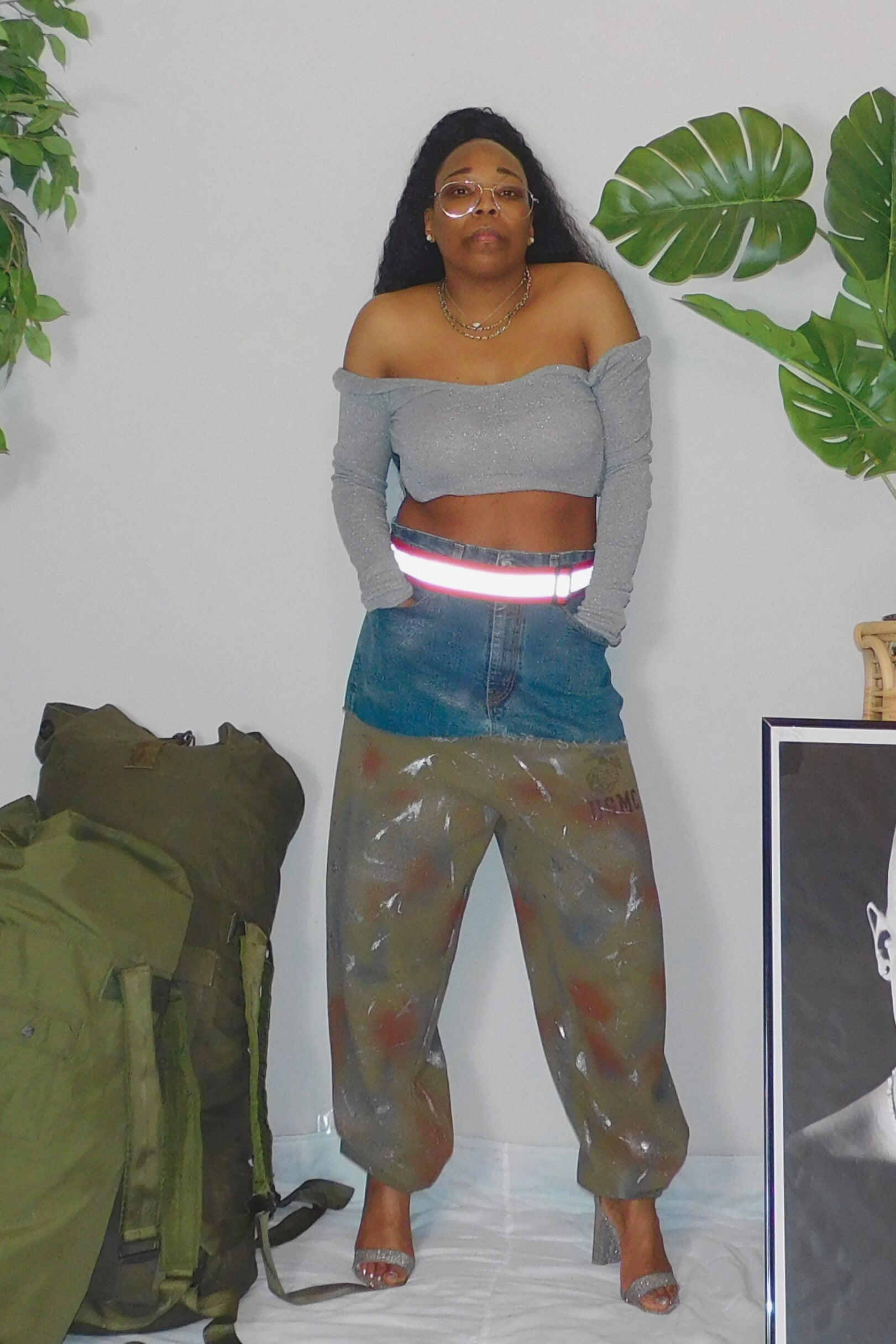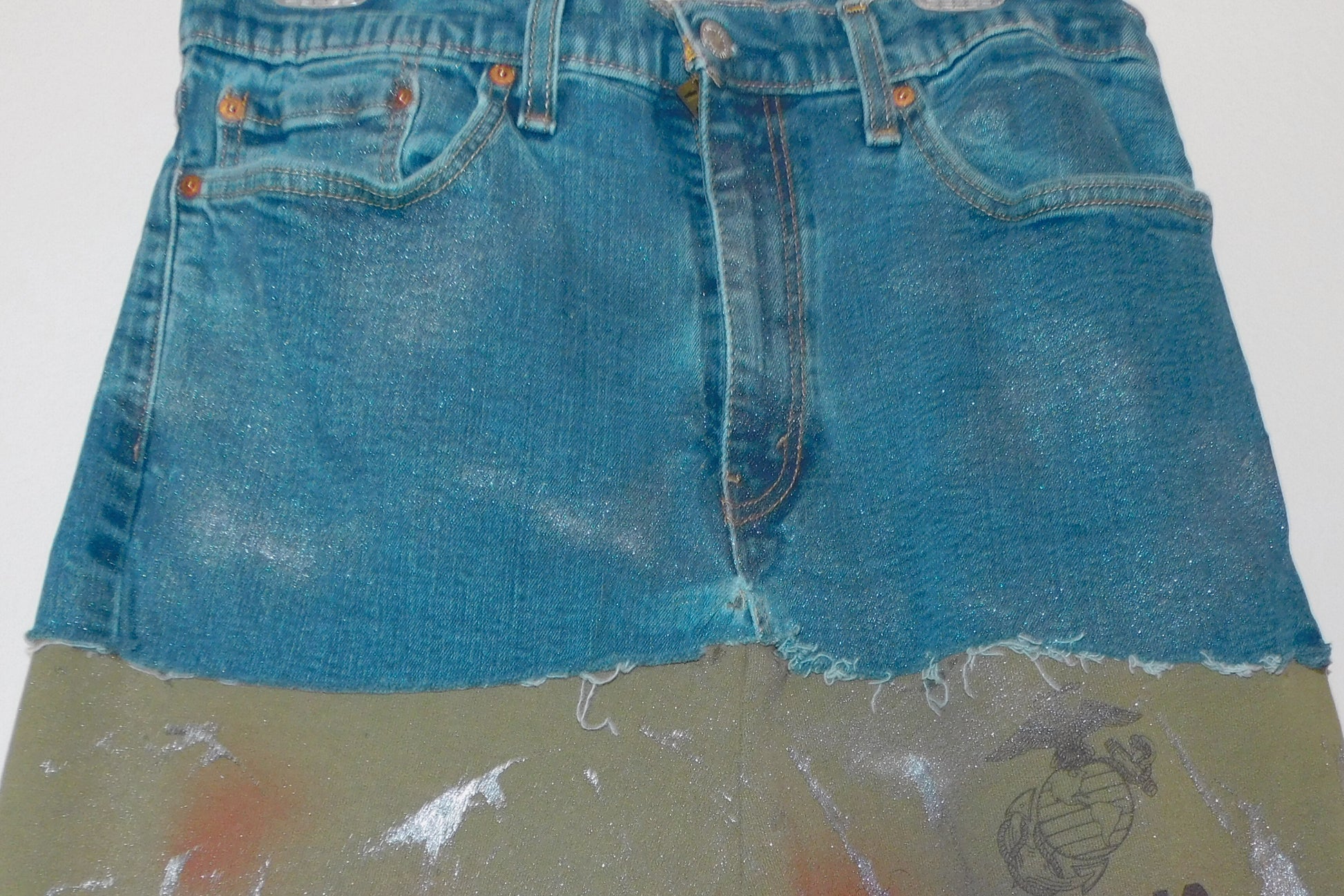Get ready to rock the streets with our SOLDIER OF FORCE Rotten To The Core! Denim Sweatpants. Made with a unique combination of old Levi denim and vintage marines sweatpants, these pants are sure to turn heads with their drop waist silhouette and drop crotch design. Plus, you'll love the silver, red, and blue spray paint and paint splatter details. With the original pockets and elastic hem, these pants are not only stylish but also functional. Measurements are as follow laying flat: Waist: 15 inches, Hips: 20 inches, Inseam (with drop crotch): 28 inches.