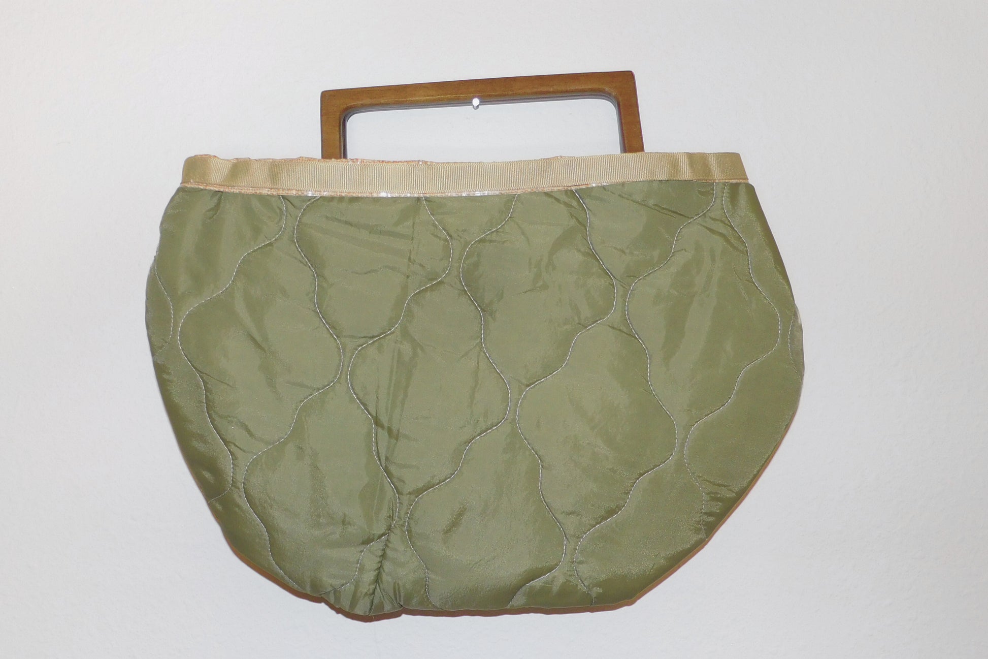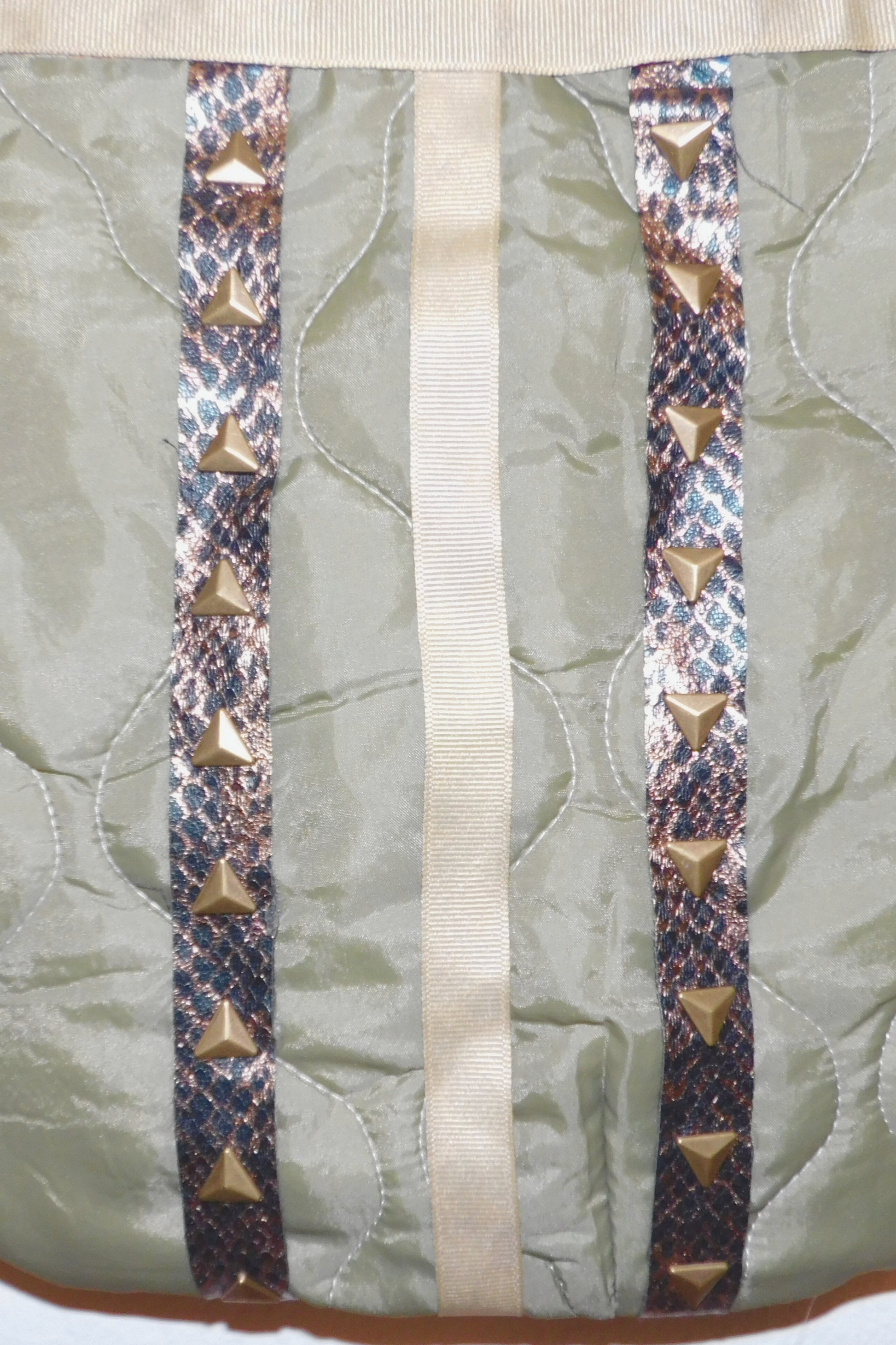 Introducing the SOLDIER OF FORCE x B'OK Media Life Grab It Quilted Bag! This one-of-a-kind bag was lovingly reworked from vintage military quilted pants. With a unique half-circle design and playful snakeskin and studded details, this bag is sure to turn heads. Plus, the tan ribbon trim and suede-like lining add an extra touch of luxury. Enjoy a stylish and sustainable accessory!