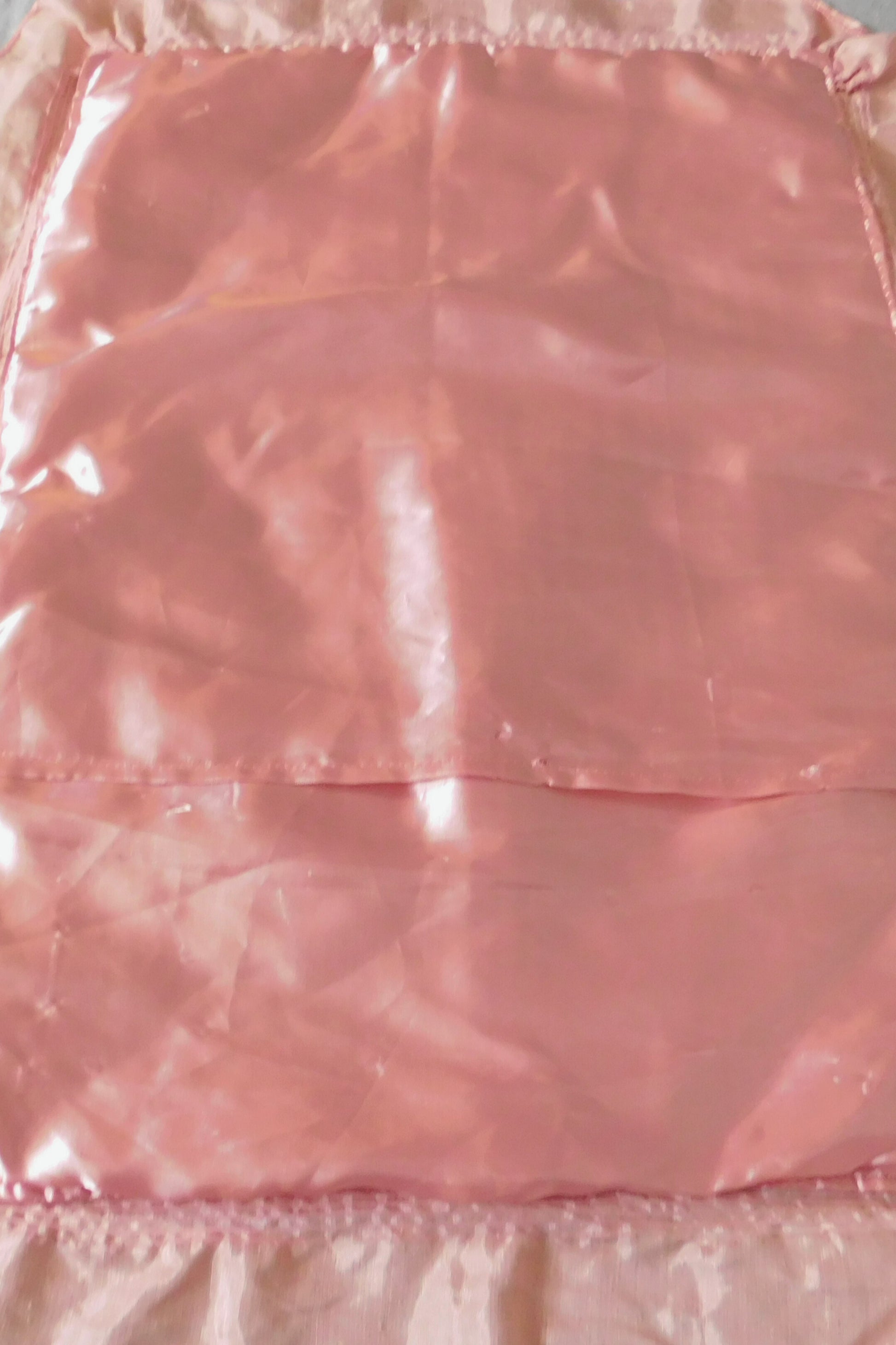 Add some vintage charm to your bedroom with this set of 2 pink satin pillow shams embellished with heart and rosette details. The slight wear gives them a cozy, lived-in feel. Sweet dreams await!